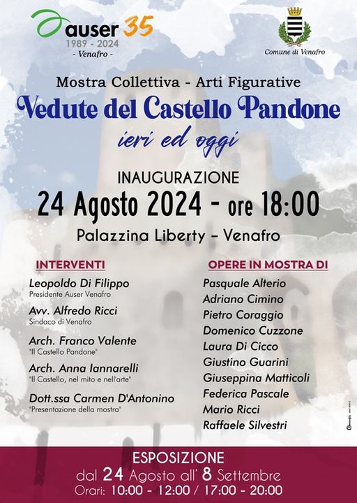Si inaugura il 24 agosto 2024 alle ore 18:00 presso la Palazzina Liberty di Venafro. La mostra presenta opere di vari artisti che ritraggono il Castello Pandone e le sue vedute nel corso degli anni.