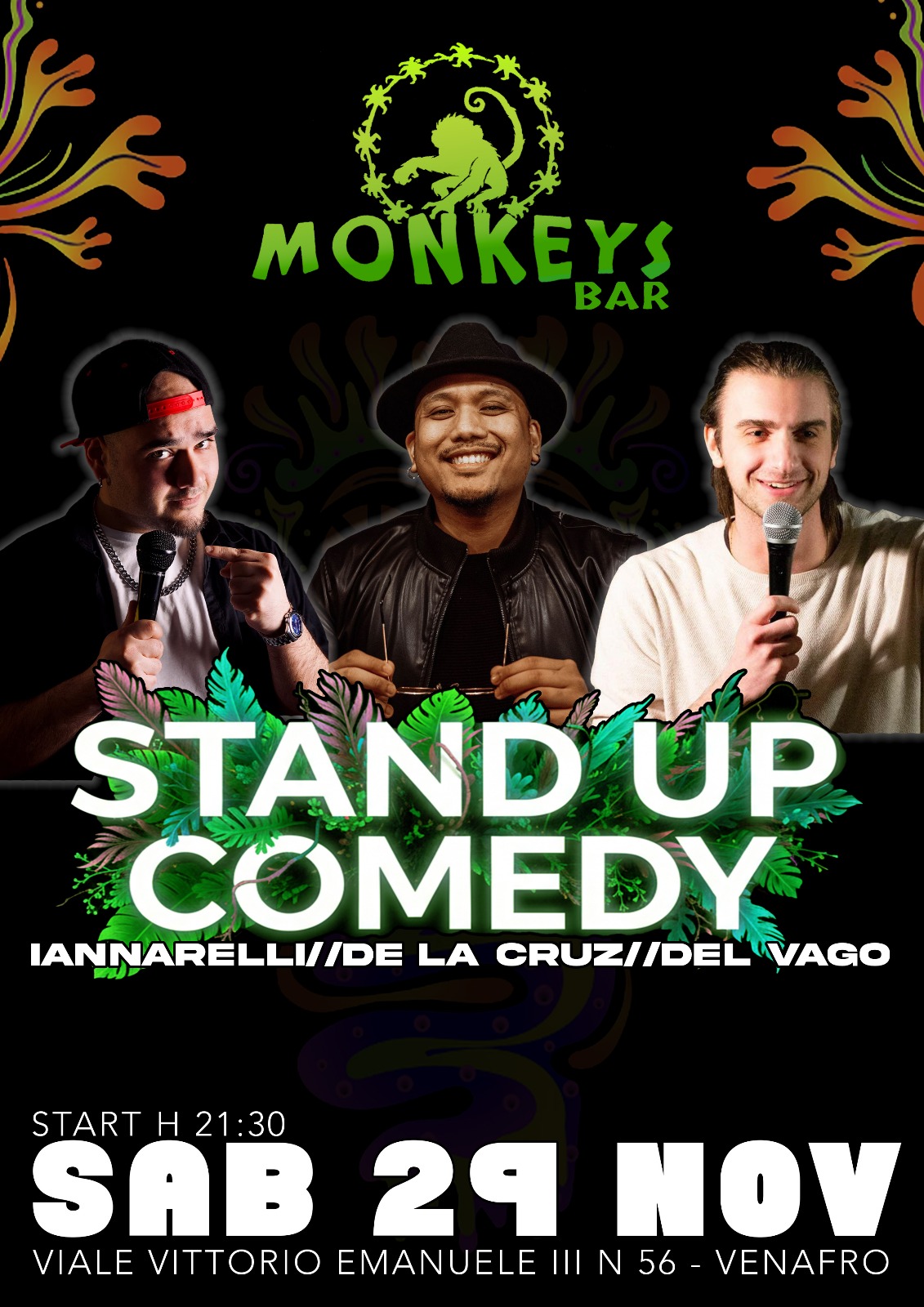 Unisciti a noi per una serata di risate al Monkeys Bar! Presentiamo un lineup eccezionale con i comici Iannarelli, De La Cruz, e Del Vago.