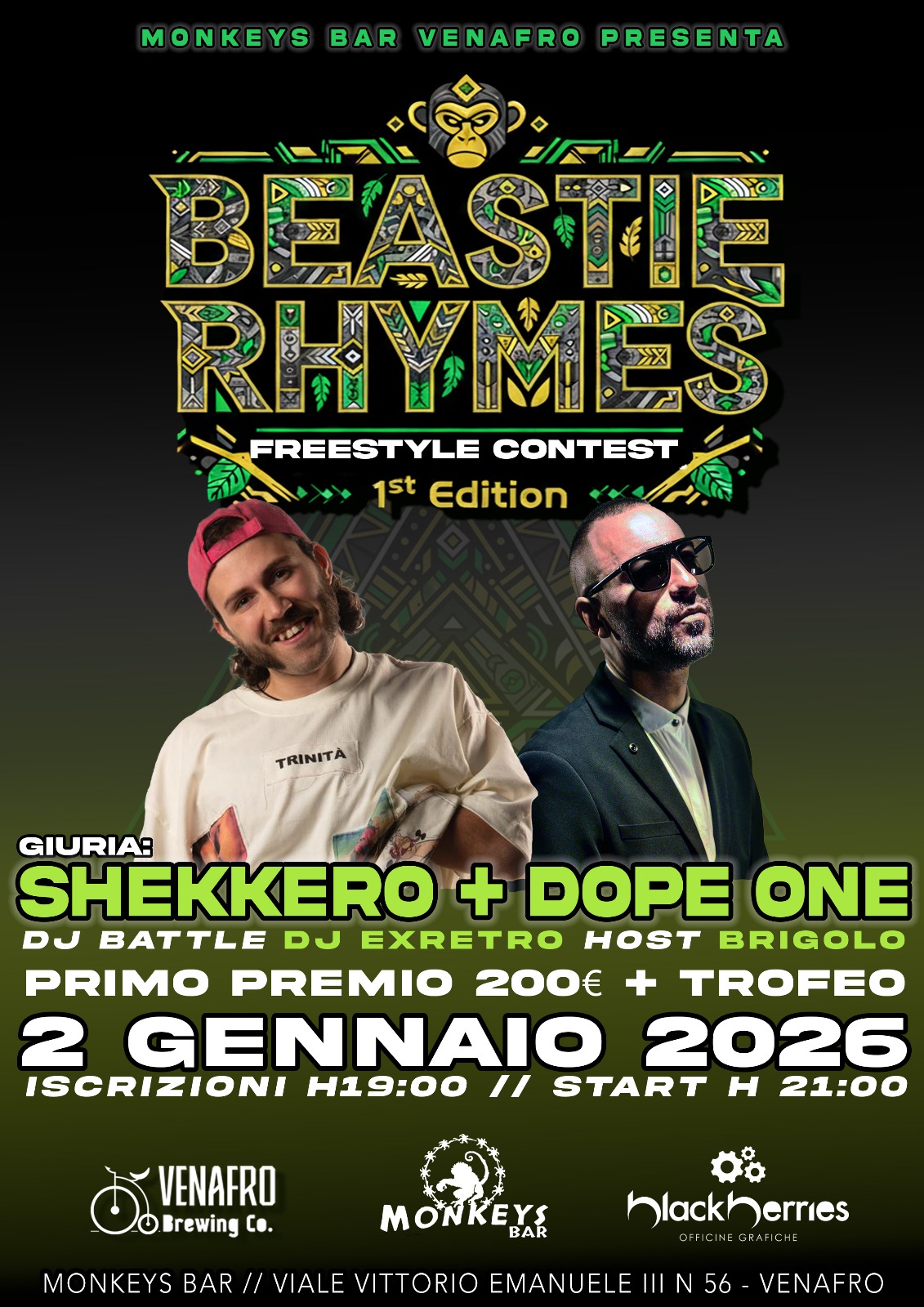Il 2 gennaio 2026, il Monkeys Bar di Venafro ospiterà il primo contest di freestyle intitolato Beastie Rhymes. Le iscrizioni apriranno alle 19:00 e la competizione inizierà alle 21:00.