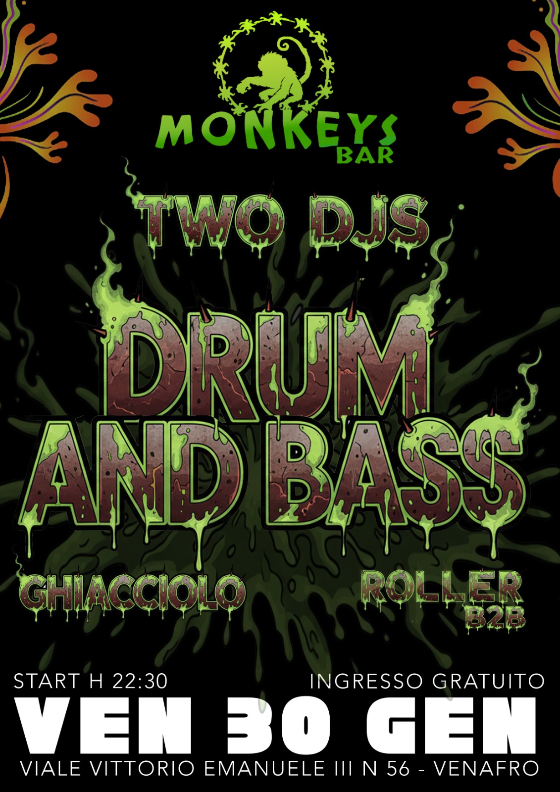 Unisciti a noi presso il Monkeys Bar per una serata indimenticabile di musica Drum and Bass. Due DJ, Ghiacciolo e Roller, si esibiranno in un’incredibile sessione B2B per intrattenerti tutta la notte.