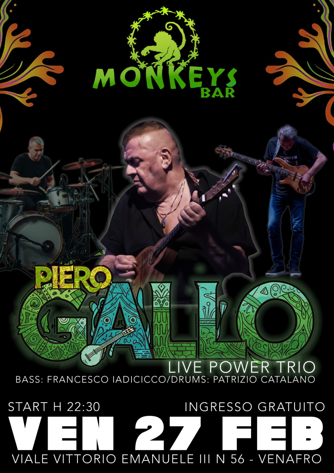 Ti invitiamo a un’incredibile serata di musica dal vivo con Piero Gallo, che si esibisce con il suo Live Power Trio. La band include Francesco Iadicicco al basso e Patrizio Catalano alla batteria. Non perdere questa fantastica opportunità di goderti la musica!