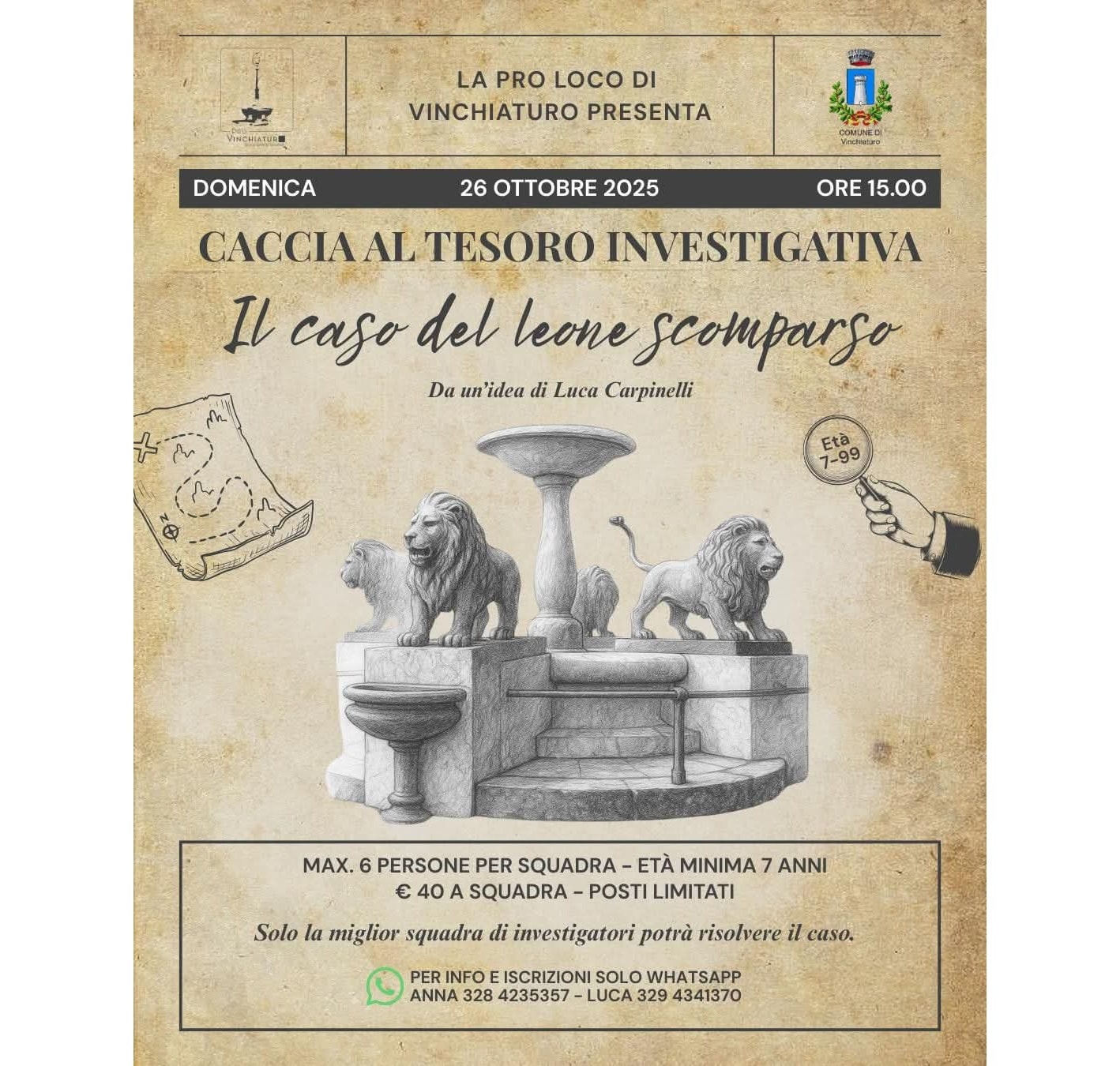 Partecipa a Il caso del leone scomparso, un’entusiasmante caccia al tesoro investigativa organizzata dalla Pro Loco di Vinchiaturo.